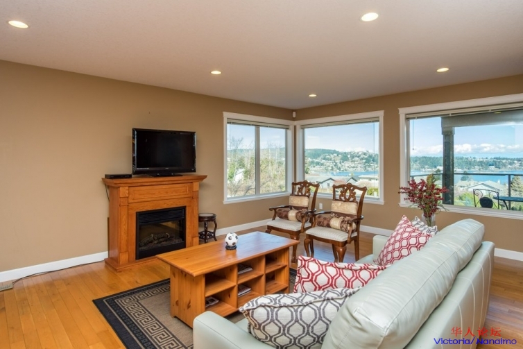 隔音材料,卫生间以及厨房地面采用地暖设计,以及开更大的窗户以及天窗,让更多的自然光线进入室内,等等。该房屋由于处于整个社区的最高处,每层都可以看到离湾(Departure Bay) 气象万千的动态海景。为了充分利用4300尺的建筑空间,屋主在首层安排了超大开放式的客厅和厨房/餐厅区,更有超大超宽的观景阳台,主卧也安排在靠海的一侧,使得主卧也可观海,宽敞明亮的5件套卫生间,如同置身五星级酒店。进门处的书房,既可以用于学习、办公,也可以