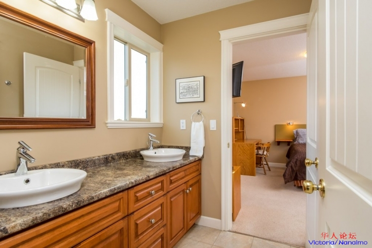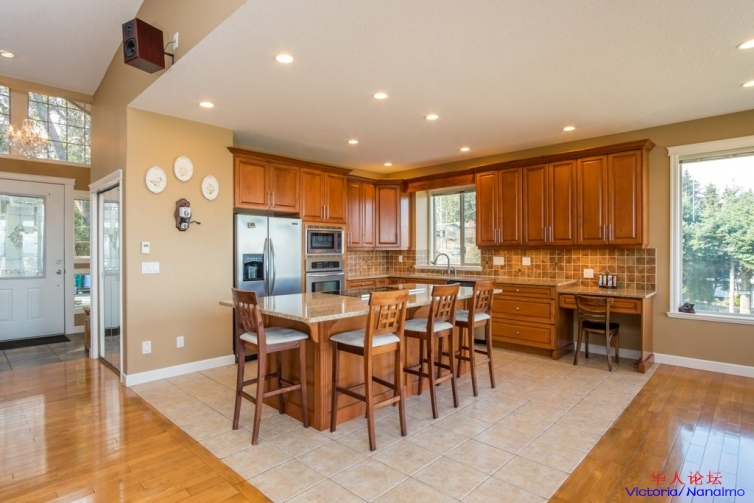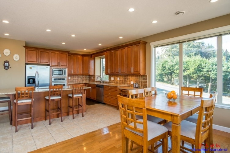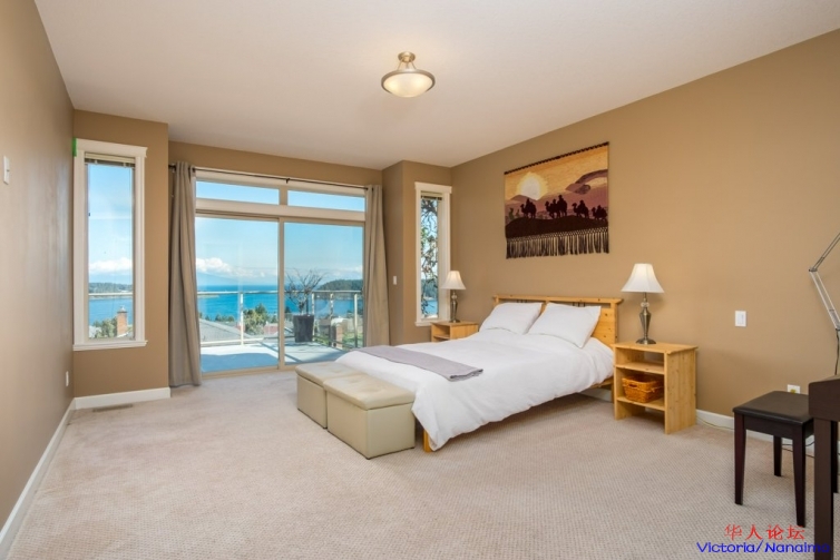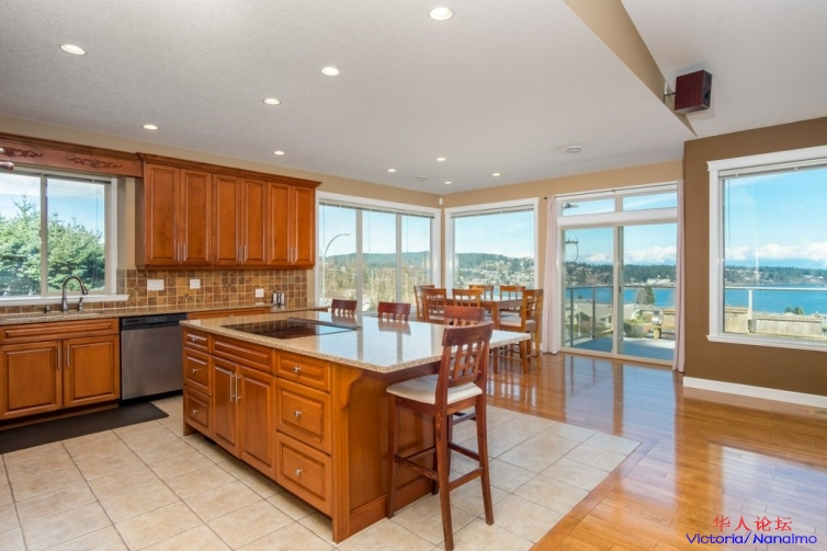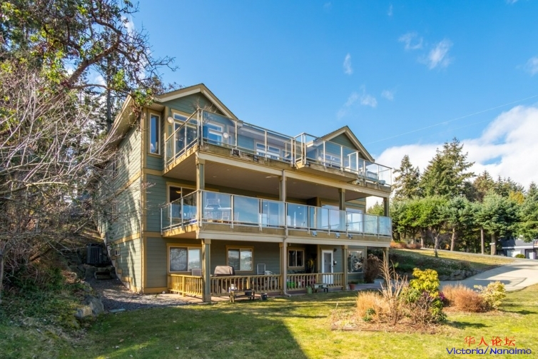 隔音材料,卫生间以及厨房地面采用地暖设计,以及开更大的窗户以及天窗,让更多的自然光线进入室内,等等。该房屋由于处于整个社区的最高处,每层都可以看到离湾(Departure Bay) 气象万千的动态海景。为了充分利用4300尺的建筑空间,屋主在首层安排了超大开放式的客厅和厨房/餐厅区,更有超大超宽的观景阳台,主卧也安排在靠海的一侧,使得主卧也可观海,宽敞明亮的5件套卫生间,如同置身五星级酒店。进门处的书房,既可以用于学习、办公,也可以