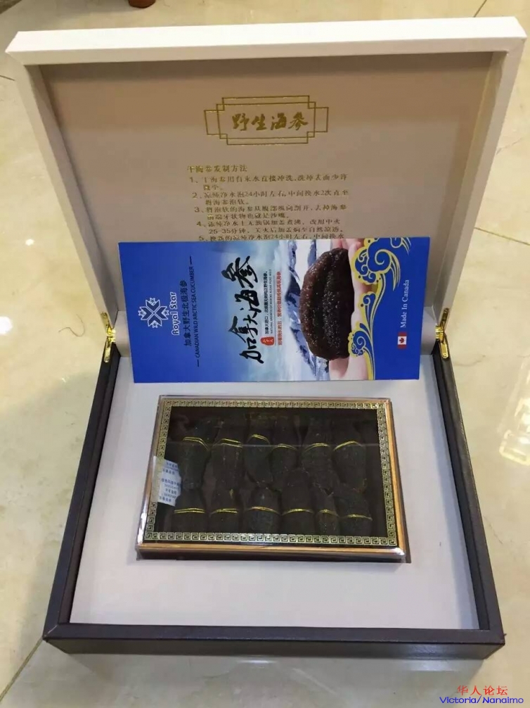 7 R& E2 R( d) C/ X加拿大海参,牠是一种名贵海产动物,生活于北极大西洋水域大约50英呎深的冷水中,该水域水温低于摄氏13°C,冬季水面结冰,终年人迹罕至并无污染的环境下生长8年。故营养价值非常高,专家曾检测北美刺参营养价值高于日本海