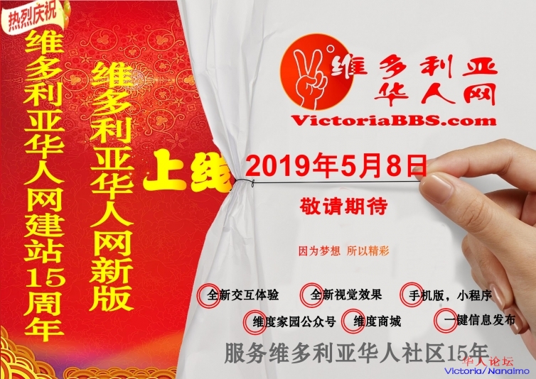 » 特大喜讯,15年后,维多利亚华人网5月8日将进行全面升,敬请期待