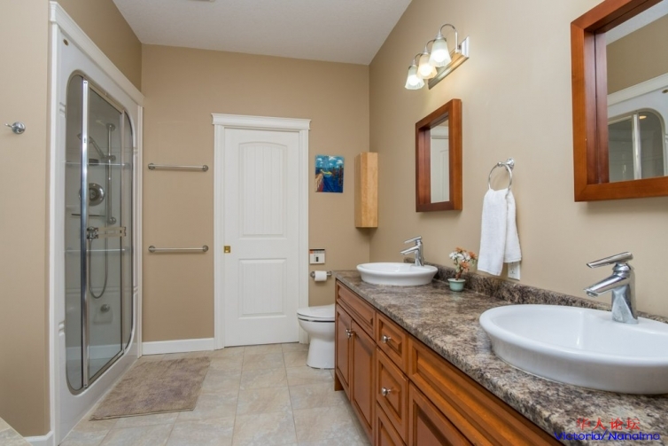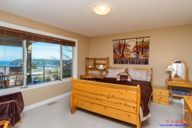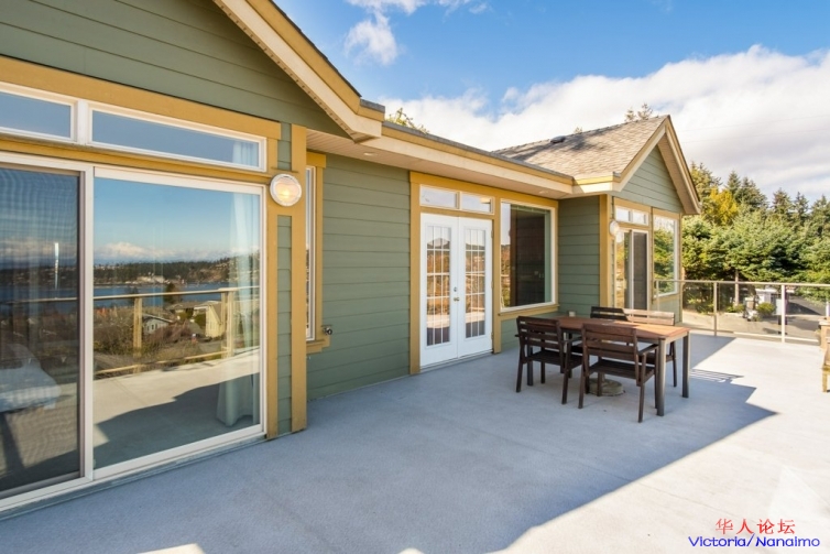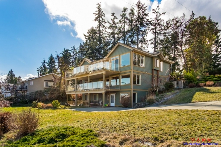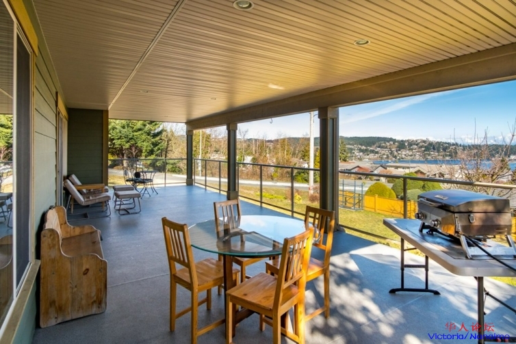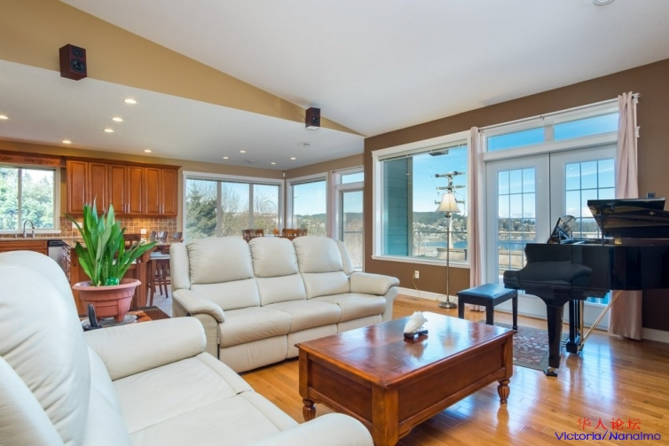 隔音材料,卫生间以及厨房地面采用地暖设计,以及开更大的窗户以及天窗,让更多的自然光线进入室内,等等。该房屋由于处于整个社区的最高处,每层都可以看到离湾(Departure Bay) 气象万千的动态海景。为了充分利用4300尺的建筑空间,屋主在首层安排了超大开放式的客厅和厨房/餐厅区,更有超大超宽的观景阳台,主卧也安排在靠海的一侧,使得主卧也可观海,宽敞明亮的5件套卫生间,如同置身五星级酒店。进门处的书房,既可以用于学习、办公,也可以