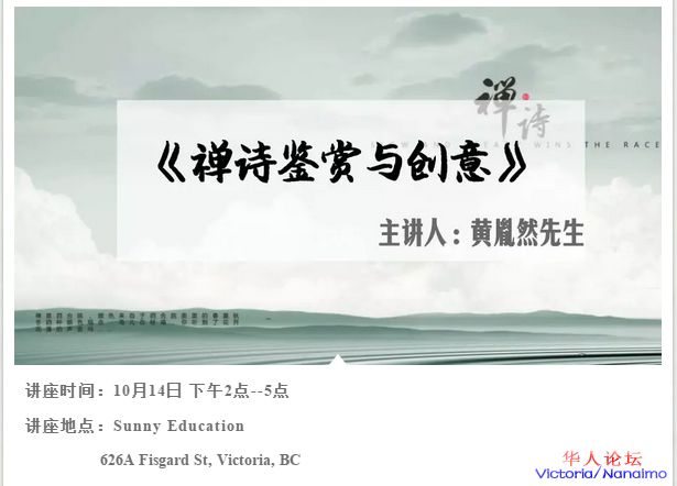 10月14日,“阳光留学生家长沙龙”将与维多利亚华人协会联合举办《禅诗鉴赏与创意》特别活动。