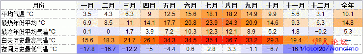Nanaimo的年平均气温为9.8摄氏度,这个数值和温哥华及维多利亚Victoria一致。