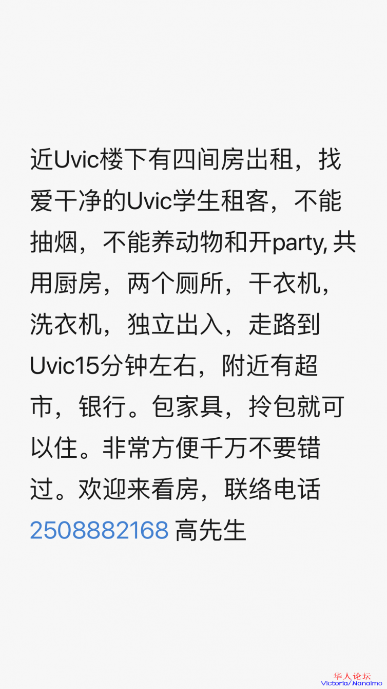 近Uvic楼下有四间房岀租,找爱干净的Uvic学生租客,不能抽烟,不能养动物和开party, 共用厨房,两个厕所,干衣机,洗衣机,独立岀入,走路到Uvic15分钟左右,附近有超市,银行。包家具。