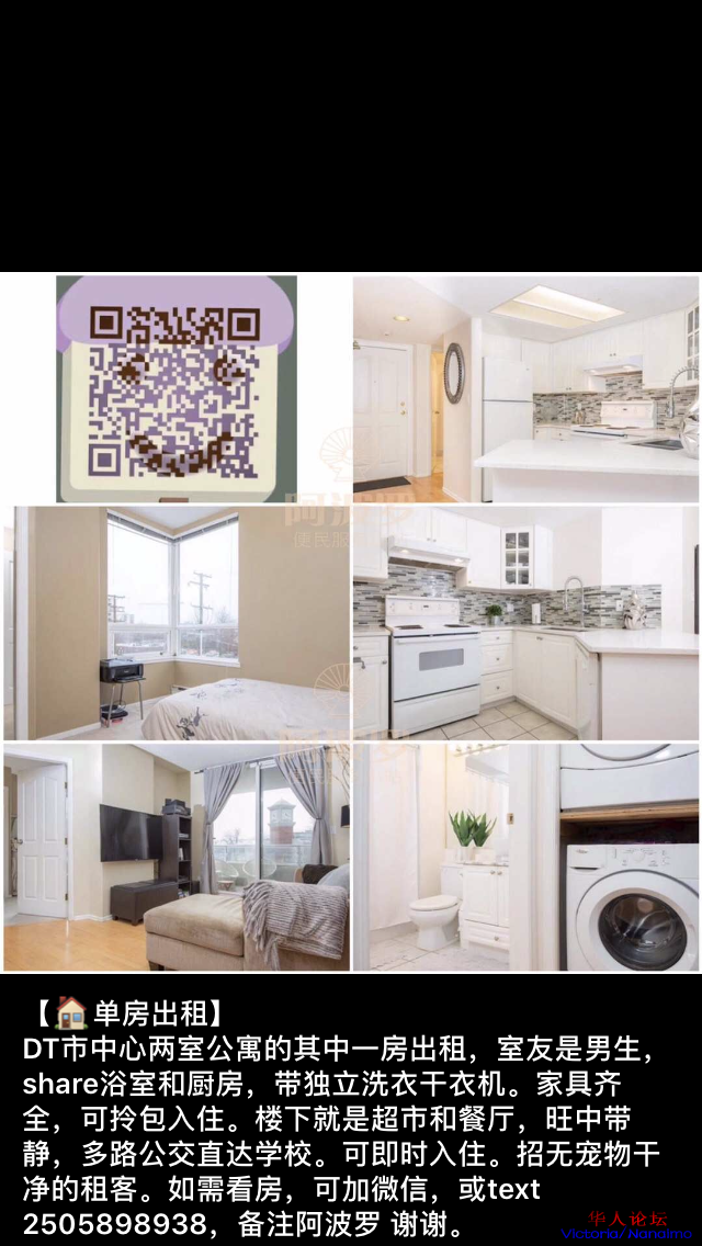 I DT市中心两室公寓的其中一房出租,另外一房间是男生在住,和室友share浴室和厨房,带独立洗衣干衣机。家具齐全,可拎包入住。楼下就是超市和餐厅,旺中带静,多路公交直达学校。可即时入住。招无
