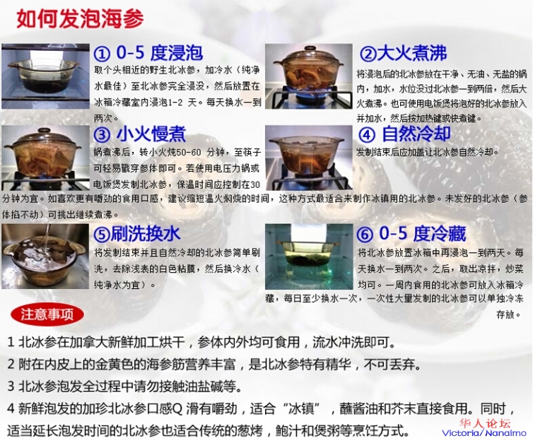 将海参放入水中浸泡两天(水是海参的三倍)。然后更换清水煮滚,调至慢火煮约60分钟,再换清水清洗后即可煮食,可拌同各种肉类、香菰等炆淋后即可享用。「唯一」加拿大海参是全部可以食用的。