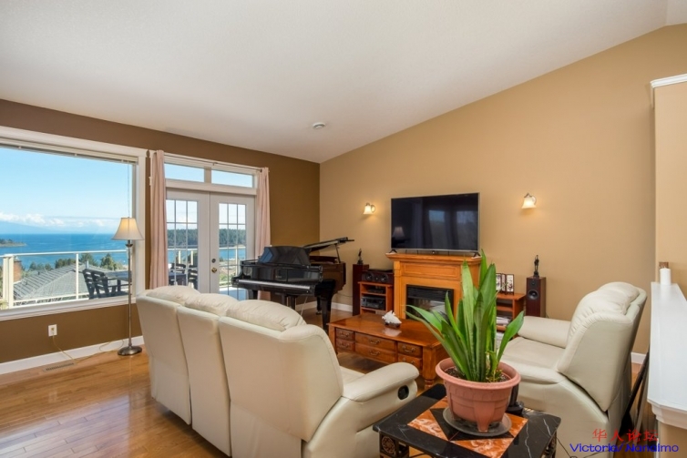 隔音材料,卫生间以及厨房地面采用地暖设计,以及开更大的窗户以及天窗,让更多的自然光线进入室内,等等。该房屋由于处于整个社区的最高处,每层都可以看到离湾(Departure Bay) 气象万千的动态海景。为了充分利用4300尺的建筑空间,屋主在首层安排了超大开放式的客厅和厨房/餐厅区,更有超大超宽的观景阳台,主卧也安排在靠海的一侧,使得主卧也可观海,宽敞明亮的5件套卫生间,如同置身五星级酒店。进门处的书房,既可以用于学习、办公,也可以