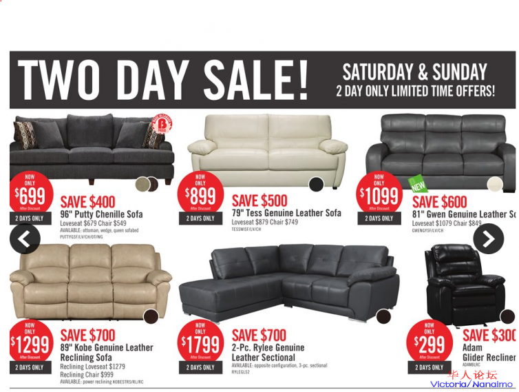 真皮沙发$899起,餐桌五件套$449起,高档橡木餐桌五件套$599,纯白L型沙发仅$1199,奢华高档床垫原价$1799,现在只要$699,高科技产品胶棉,恒温系统保持您安稳睡眠,全身心投入到生活中去。