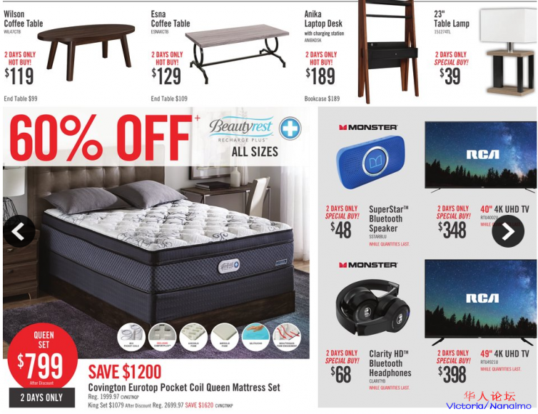 服务本地居民45年之久,本周末几十种商品打折,床头床架$299起,海尔海信冰箱以及55寸4KTV仅要$498,美的洗碗机,这些华人品牌在The Brick皆有折扣。