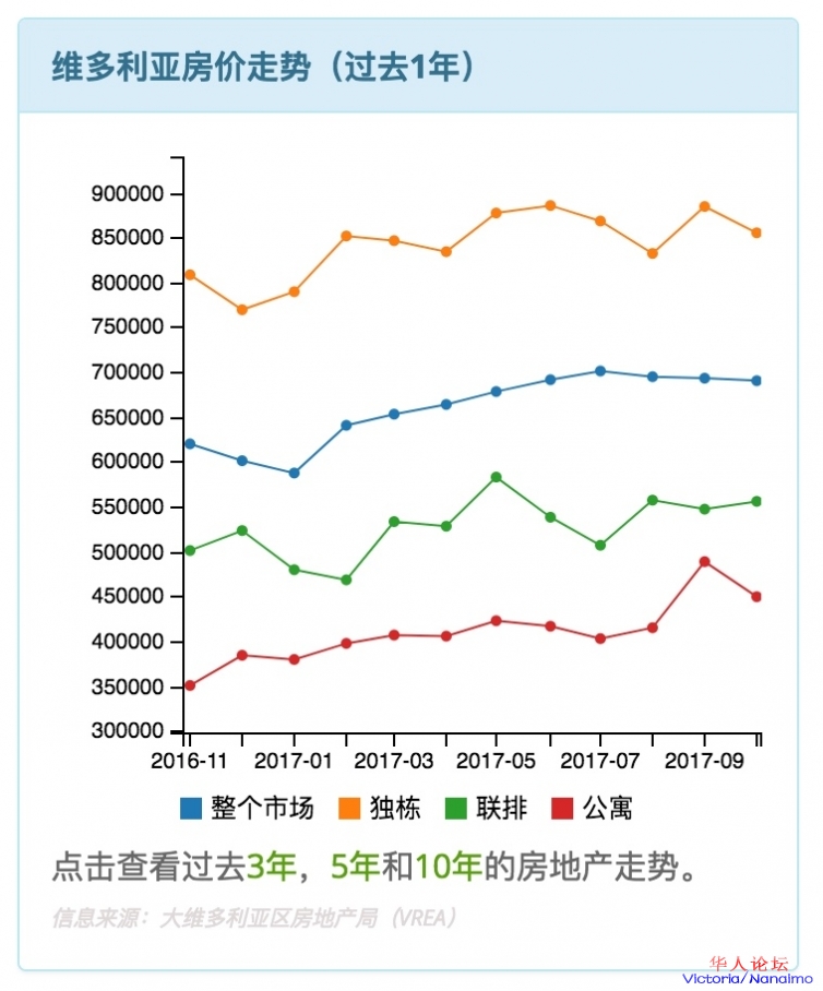 维多利亚房地产市场过去3年、5年和10年的房地产价格变化,按照公寓、联排和独栋分类显示。查看更多趋势图,请看:http://vicfang.com/market_trend.php