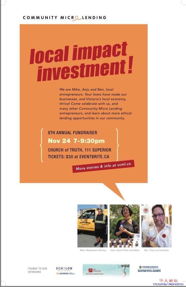 2017年度VCMLS慈善拍卖晚会Victoria Community Micro-Lending Annual Fundraiser, 将于11月24日在Church of Truth(渔人码头附近)举办,感谢我们的捐助方,照亮我们的企业家,为我们的组织筹集资金。我们也很高兴能与客座发言人希瑟·哈奇吉安一起来强调投资的影响。她是目标资本(一家投资影响咨询公司)的高级顾问,也是卡尔顿社区创新中心的研究人员。晚会将提供清淡的开胃菜,现金酒吧和各类拍卖物品。