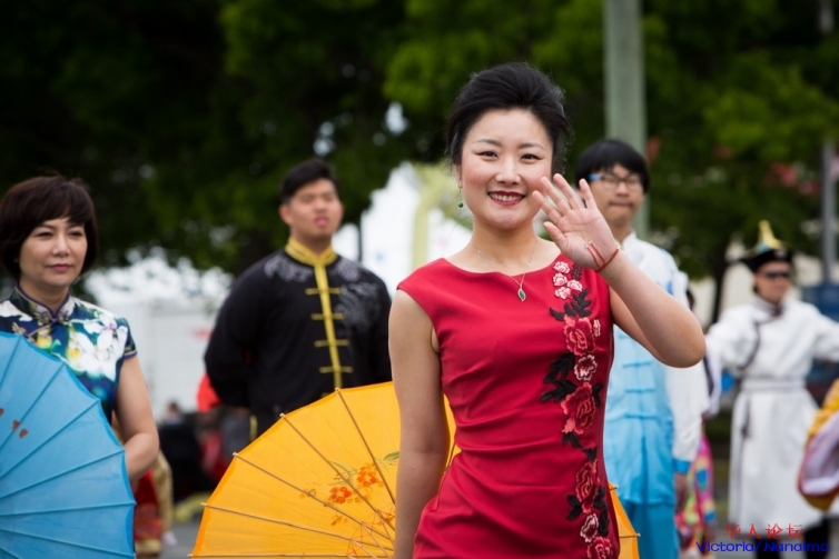 95个团体参与了这次游行,今年的游行,从参与人数,队形阵容等,都比往年更热烈,宏大,大家的参与热情非常高。为凝聚华人社区,展现华人风采,维多利亚华人协会组织了一支60多人的华人游行队伍代表华人社区参与了此次盛大的游行。这个游行方阵由旗袍队,陈瑜太极维多利亚和邓肯队,维多利亚中华艺术团的成员组成。