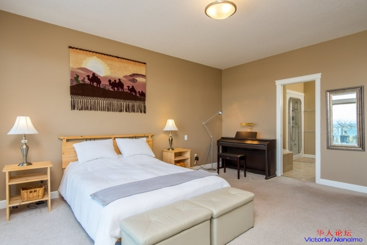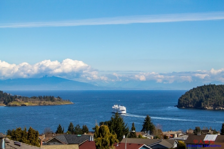 隔音材料,卫生间以及厨房地面采用地暖设计,以及开更大的窗户以及天窗,让更多的自然光线进入室内,等等。该房屋由于处于整个社区的最高处,每层都可以看到离湾(Departure Bay) 气象万千的动态海景。为了充分利用4300尺的建筑空间,屋主在首层安排了超大开放式的客厅和厨房/餐厅区,更有超大超宽的观景阳台,主卧也安排在靠海的一侧,使得主卧也可观海,宽敞明亮的5件套卫生间,如同置身五星级酒店。进门处的书房,既可以用于学习、办公,也可以